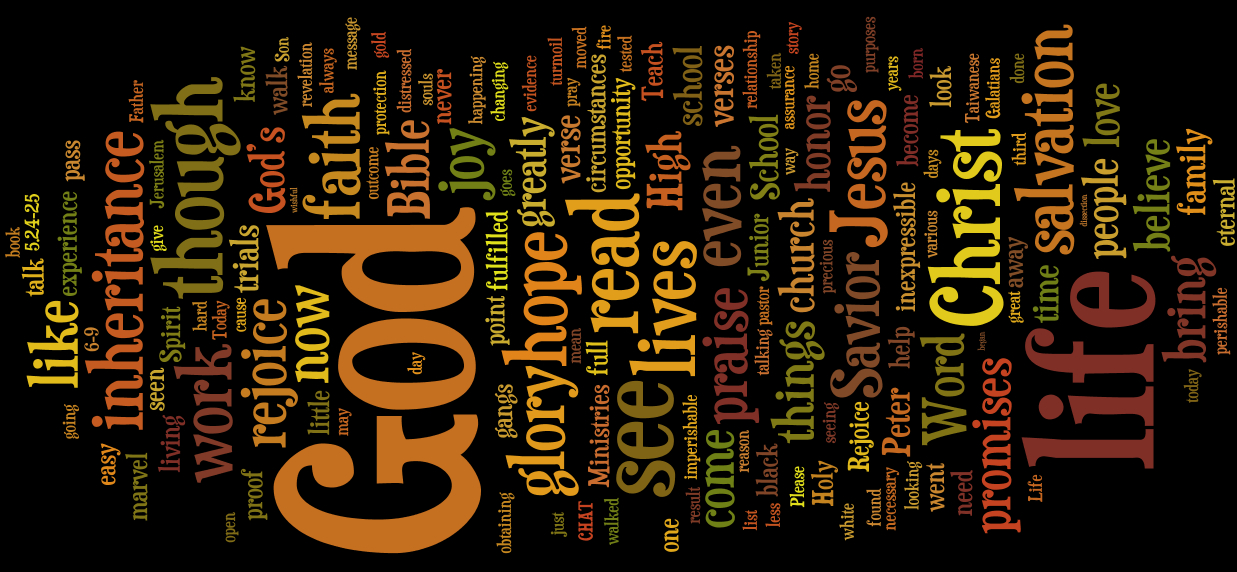 Salvation brings to us a hope that is not known apart from God. The word hope doesn’t mean wishful thinking, that someday this might happen. In the Bible it means the assurance that it will come to pass. Such as the hope mentioned in Hebrews 11.1: faith is the assurance (proof if you would) of things hoped for, the conviction that things unseen will come to pass. This tells us that what we read in God’s Word, the Bible, will come to pass. All the promises of God are going to be fulfilled. We can see the marvelous examples of His Word being fulfilled throughout the Bible, from a coming Savior in Genesis 3 to the very day that Savior will enter Jerusalem in Daniel 9 to the destruction of Jerusalem in A.D. 70. The most telling evidence of the promises of God being fulfilled is in our own lives. I remember when I was in Junior High School. I was small and an easy target for gangs to take their troubles out on. I would go to school every day in the seventh grade only to go home with a little less money or a project that I had worked on so hard in shop classes taken away from me. All this happened to by the hand of the black gangs called the Crips and the Bloods. I was a white guy walking through the dividing line of both gangs. I had become a Christian in 1972 in Germany. I walked into a church on a Sunday evening, tired from a long walk, not even knowing it was a church because I had never been in one before. The pastor was giving the salvation message. I went forward to receive Christ as my Savior. The pastor there didn’t tell me to go home and read the Bible or to go to church. He just welcomed me into God’s family. Shortly after this, we moved to California when all this turmoil at school began. I dropped out of Junior High School. When it came time for High School, we had moved. I went to a safer school, graduated with high honors. The reason I bring this story up is what God did in that time. Remember, I still loved God, but didn’t know anything about Him. I didn’t pray regularly. But God was doing a work in my life that I would begin to see evidence of in High School but come to fully realize later in life. When I read Galatians 5.24-25, I can’t help but praise God for fulfilling His promises in my life. My family is from Iowa and North Carolina. Their beliefs about people who are not white are less than godly. When my family heard what was happening to me in school, they were angry at black people. When they hear my story, they are amazed that I have pastored Taiwanese churches all my life, over 22 years now. They marvel that my best friends are black, Filipino, Chinese, Taiwanese, Hispanic, and the list goes on. They wonder how it could be so when my Junior High years were so tumultuous. This is why I marvel at Galatians 5.24-25. You see, God promises that His Holy Spirit will work in our lives producing love, not bitterness, joy, not anger, peace, not turmoil, patience, not frustration, kindness, not vengeance, goodness, not hatred, and so the list goes on. God was doing what He promised in my life without me realizing it was happening. The hope that is within me, is that God will accomplish His work in me and through me. We all have this hope. God is at work in the world, we just need to see it.