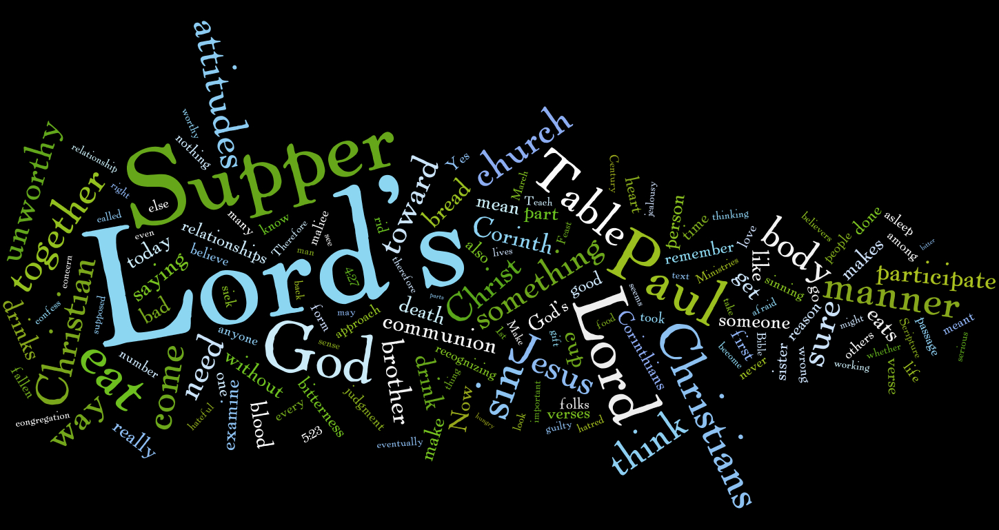 What does that mean? Maybe you have heard that it has something to do with thinking about Jesus’ physical body as we share in the Lord’s Supper, but I don’t think that fits the context. Rather, I would suggest “the body of the Lord” is the body of Christ, the church, people who are believers in Jesus. I think the person who participates in the Lord’s Supper without recognizing the relationship he has with other Christians, who is interested not in serving people but in using them, is the individual who is participating in an unworthy manner and may face God’s judgment. Thus, I would say that when we examine our lives before we eat at the Lord’s Table, the focus should not be so much on our vertical relationship with God, but on our horizontal relationships with other Christians. Obviously the two are connected. In many ways the vertical relationship is more important, but in this passage, I believe Paul is saying we should make sure we are treating those within the body of Christ in the right way, make sure we don’t have bitter or hateful attitudes toward a Christian brother or sister before we eat and drink the Lord’s Supper.